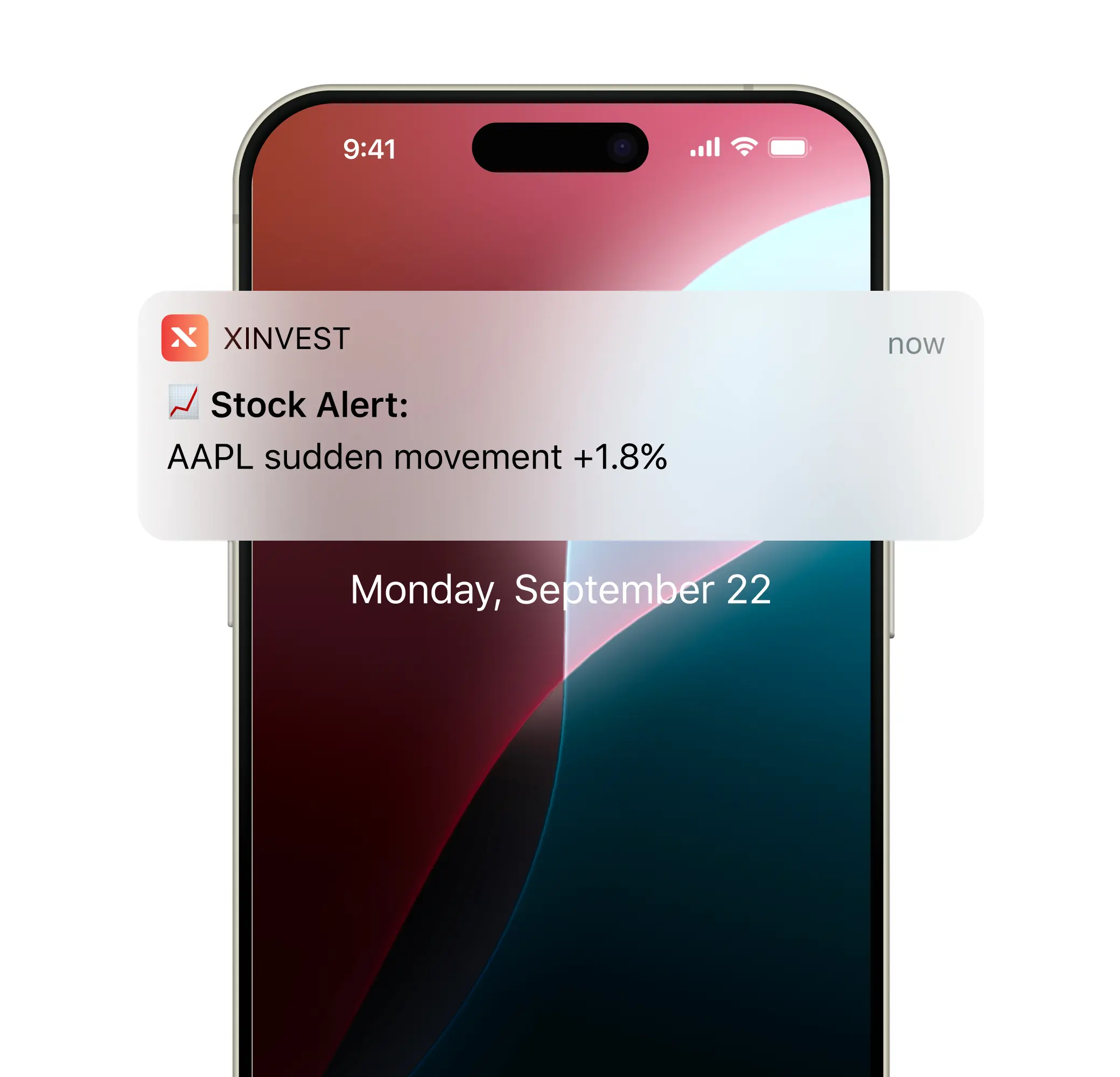 Mantente informado en todo momento y lugar con XInvest. Nuestra plataforma envía alertas instantáneas directamente a ti, impulsadas por un conjunto inteligente de seis indicadores de trading diseñados para detectar cambios repentinos del mercado con precisión. Siempre tendrás información en tiempo real al alcance de tu mano.