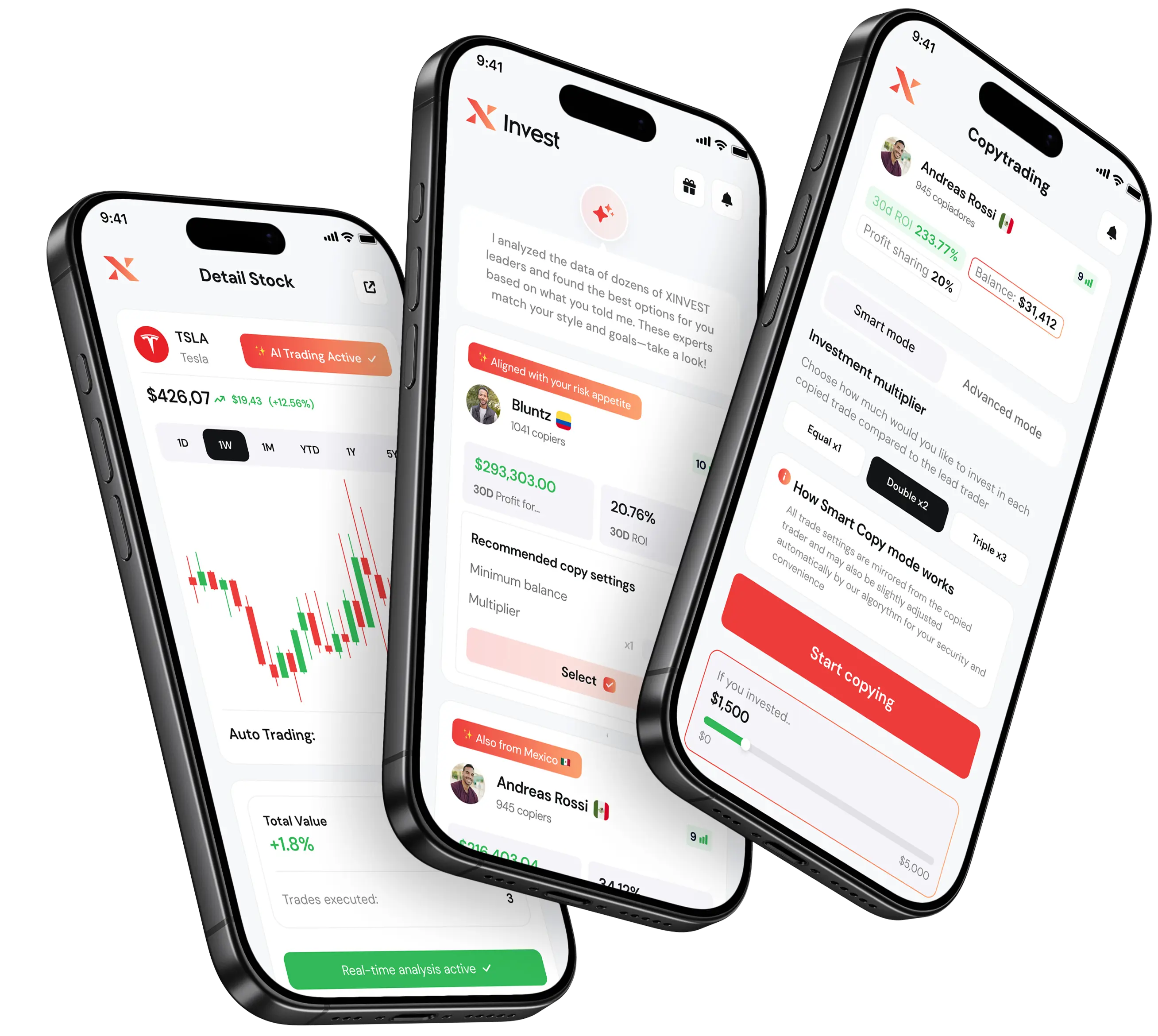 XInvest es una plataforma de trading impulsada por IA que te permite automatizar tus inversiones y copiar operaciones de traders top. También puedes elegir trading manual mientras aprovechas información del mercado en tiempo real.